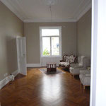 Eine Altbauwohnung erstrahlt in neuem Glanz. Ein schlichtes Weiß für Wand u. Deckenflächen und zusätzliche weiße Kassettentüren mit einem dominaten Parkettboden, ergeben einen schlichten aber wirkungsvollen Eindruck.